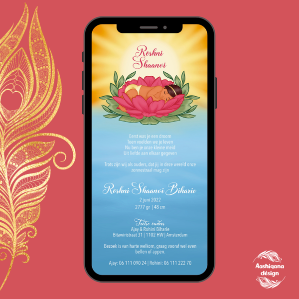 Verstuur een geboortekaartje of nodig je gasten uit voor een feestje of mundan sanskaar (moeran) met deze mooi geïllustreerde digitale kaart/uitnodiging met een lief meisje dat ligt te slapen in een roze lotusbloem op het water. Op de achtergrond is de zon te zien die zijn warmte over de baby uitstraalt. Deze illustratie is met name geschikt voor een meisje wiens naam licht of zon betekend.
