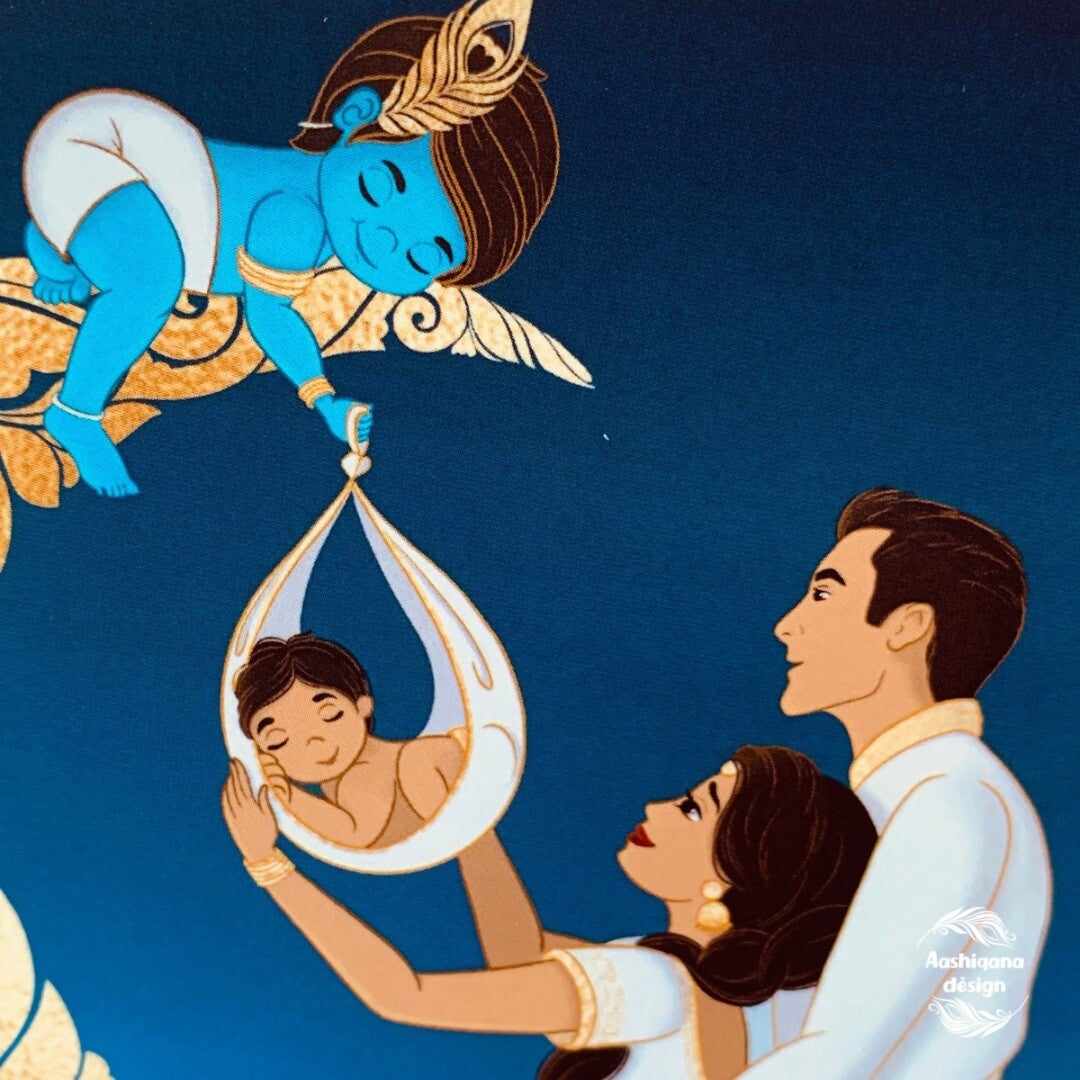 Deze wenskaart is speciaal ontworpen voor Hindoestaanse ouders een speciale band hebben met de god Krishna.