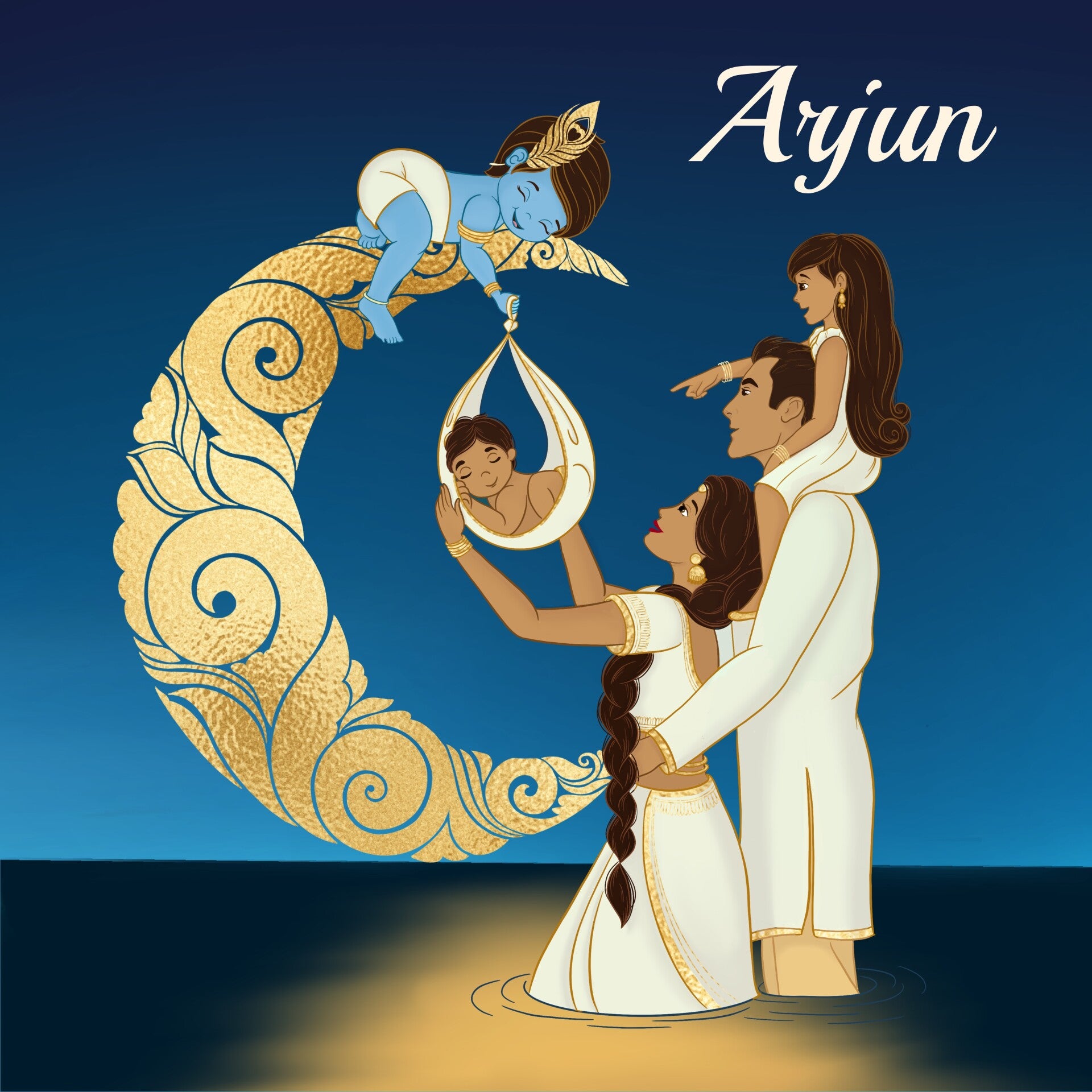 Het handgetekend geboortekaartje "Krishna's Zegen", combineer een diepere spirituele betekenis en met de komst van een nieuw leven. Dit unieke ontwerp toont de Hindoe god Krishna liggend op de maan, terwijl hij een baby schenkt aan de ouders die vol blijdschap in de heilige rivier Ganges staan. Op de schouders van de vader is de grote zus te zien, die vol blijdschap wijst naar haar nieuwe broertje. De donkere avondlucht op de achtergrond, in een diepe donkerblauwe kleur, voegt een mystieke en serene sfeer toe aan het geheel.