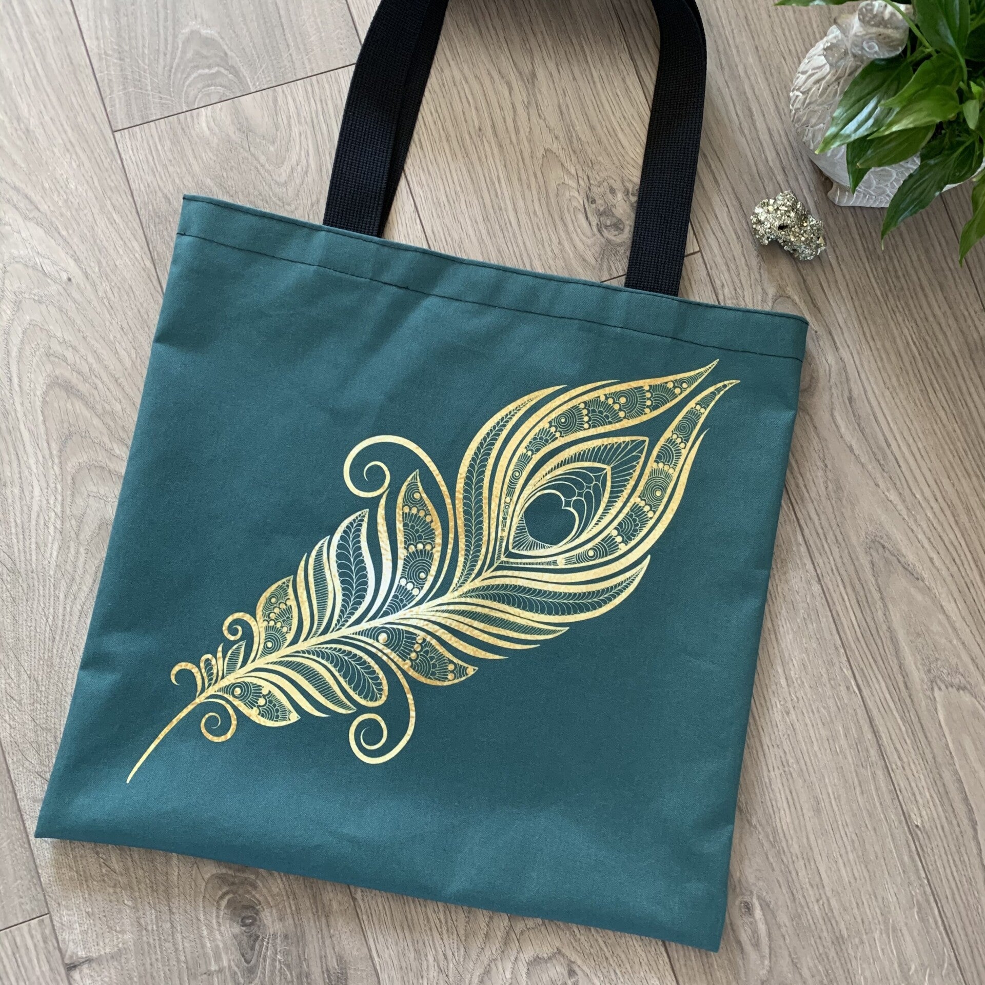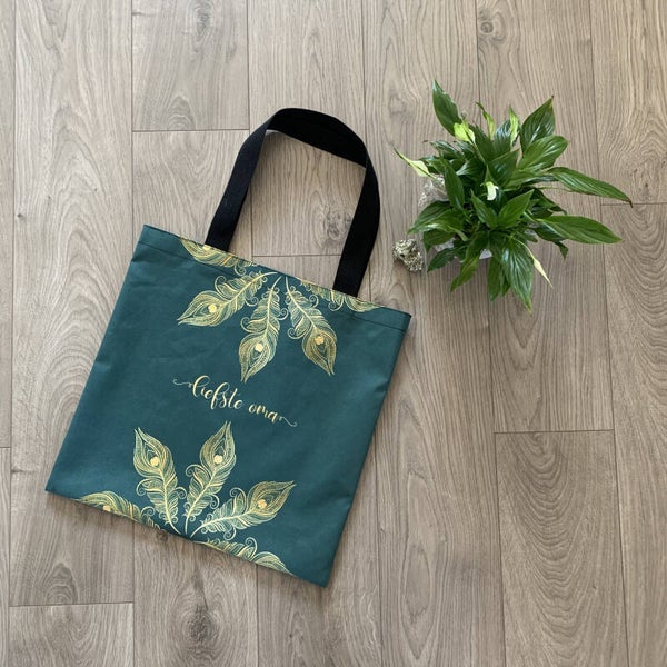 Hoe leuk is deze draagtas met een Indiase touch door de gouden pauwenveren op een groen/blauwe achtergrond. Een super leuk verjaardagscadeau of cadeautje voor moederdag.