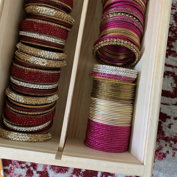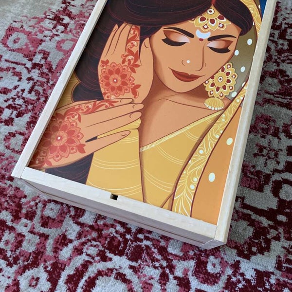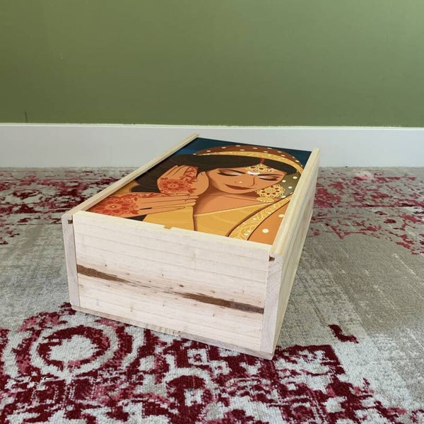 Bewaar je churiya's (armbanden) in deze stevige houten doos, die aan de voorzijde is voorzien van een mooie illustratie van een Hindoestaanse dulhin (bruid). Het tussenschot verdeelt de binnenruimte van de doos in tweeen, zodat je twee rijen armbanden kwijt kan. Het is ook mogelijk het tussenschot eruit te halen, zodat je ook andere voorwerpen, zoals bijv. je trouwsieraden hierin kun bewaren. De doos is te verkrijgen met en zonder personalisatie.