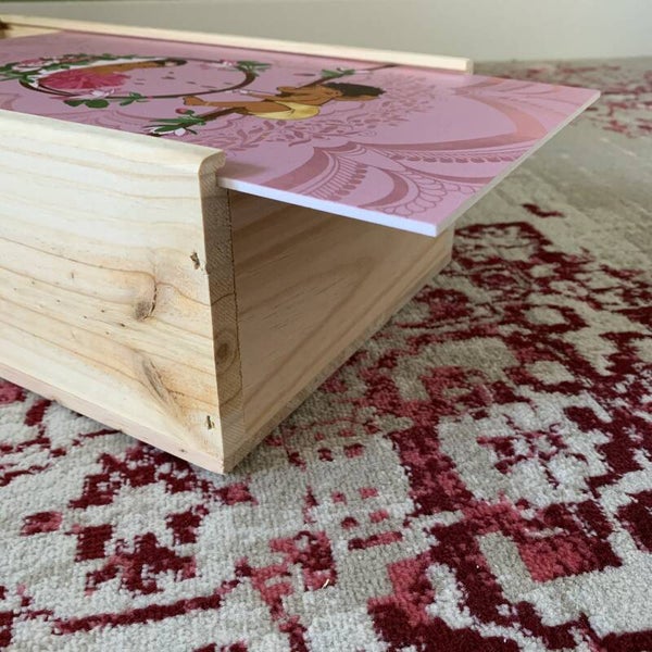 Bewaar de eerste spulletjes van je kindje in deze houten bewaardoos met daarop een mooie illustratie van baby Ganesh die zijn zegen geeft aan een slapend Indiaas meisje. De doos is te verkrijgen zonder en met personalisatie.