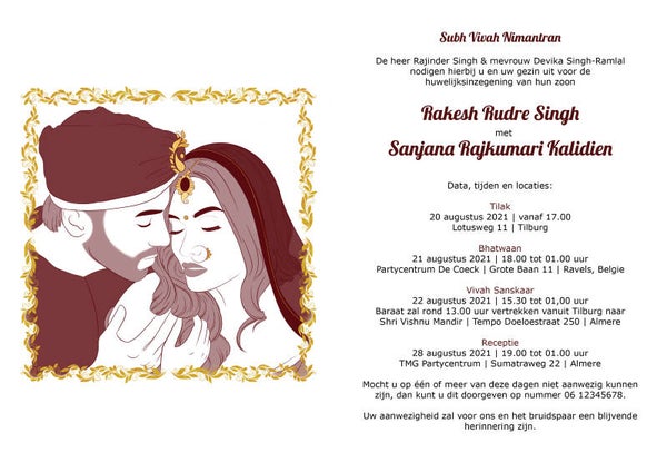 Een digitaal uitnodiging met een romantisch koppel in Indiase kleding (dulha/dulhin) speciaal voor een Indiase/Hindu wedding (Vivah Sanskaar/Bhatwaan).