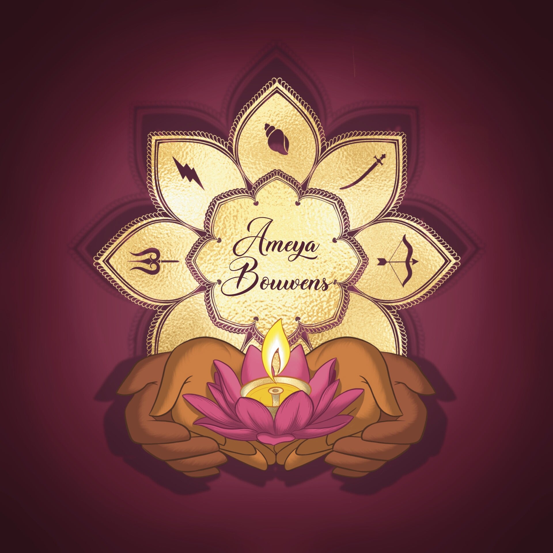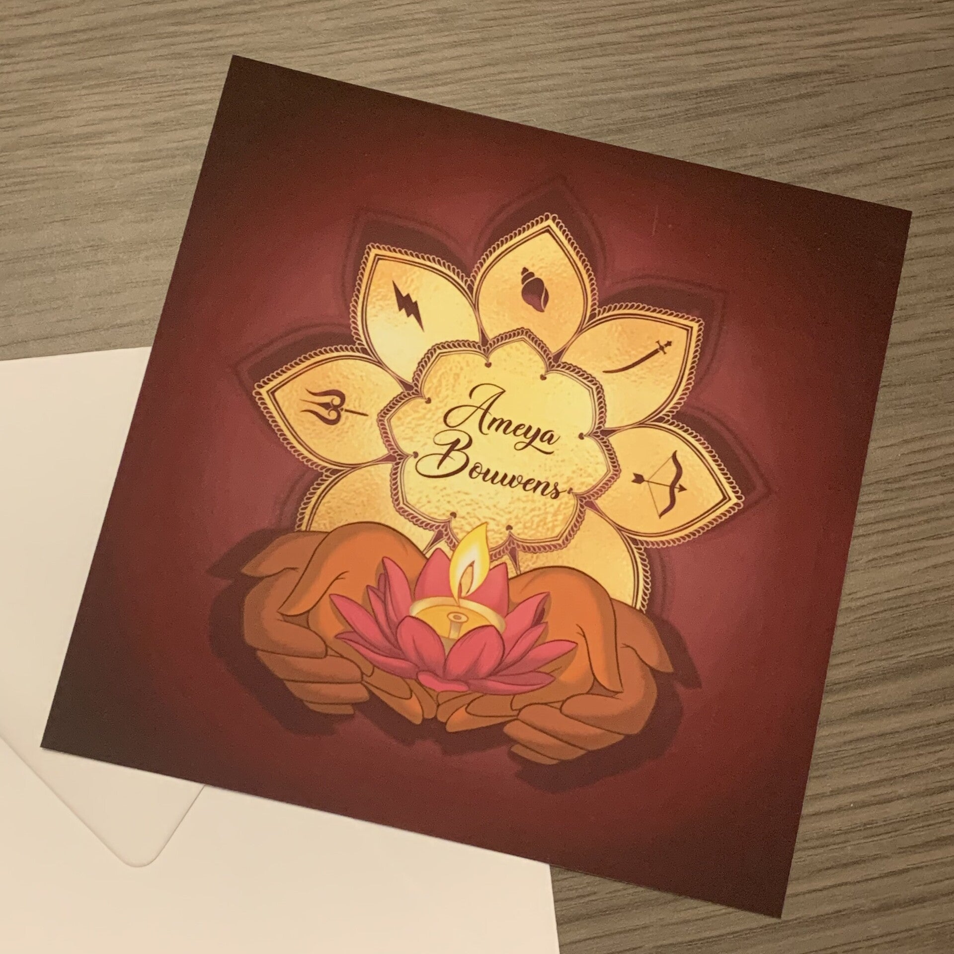 Een prachtig geboortekaartje met een brandende diya (olielampje) die wordt gedragen door de handen van de ouders. Op de achtergrond is een gouden mandala te zien met daarin verschillende attributen van Durga, die Hindoe moedergodin, die symbool staan voor het volgende: